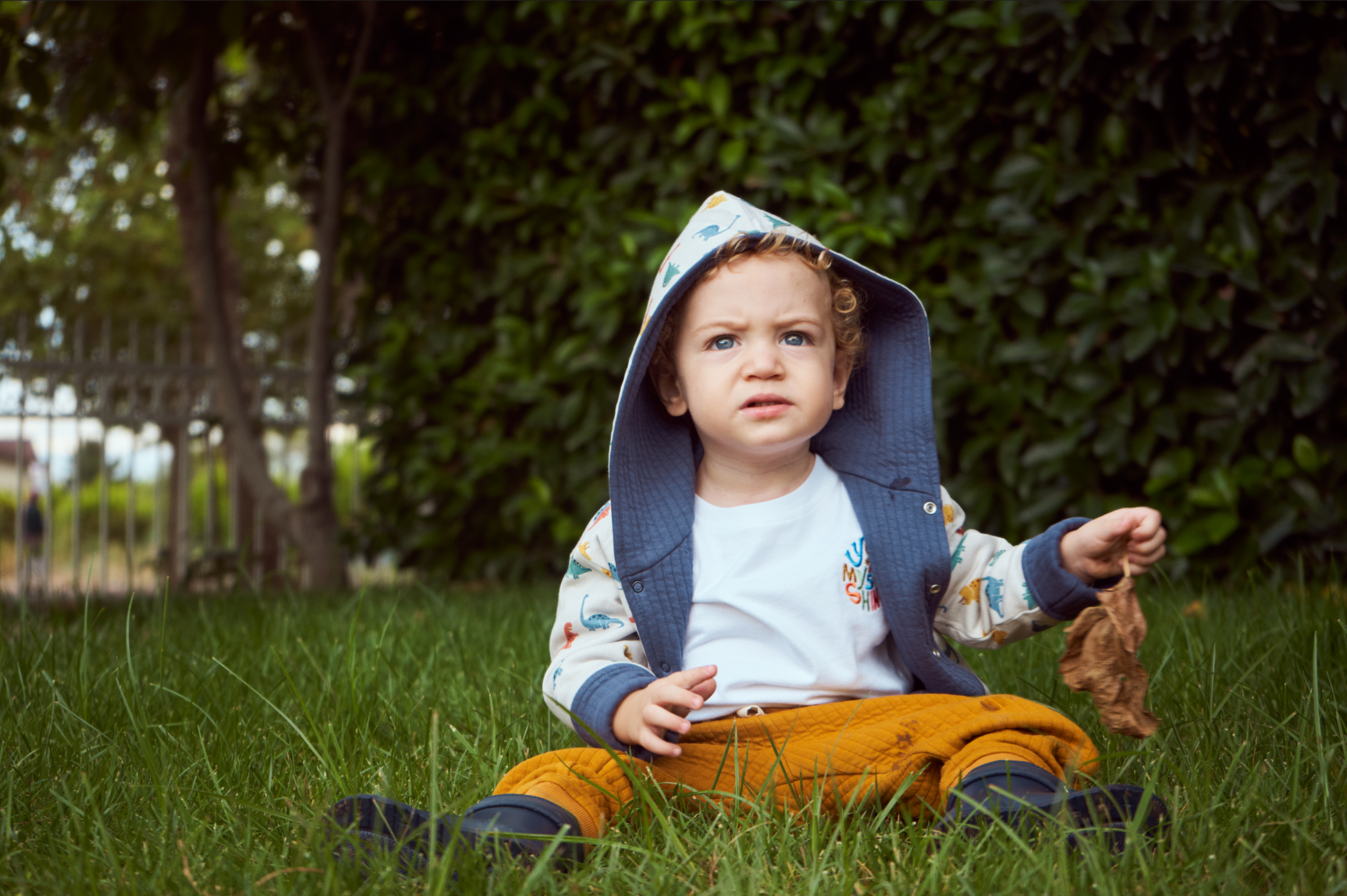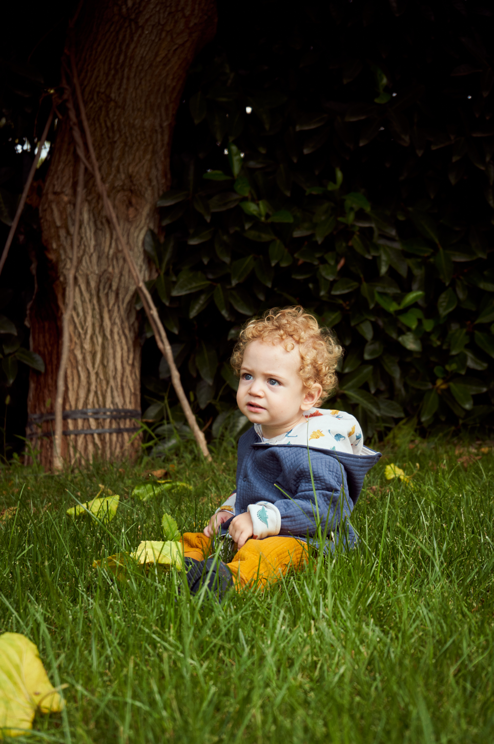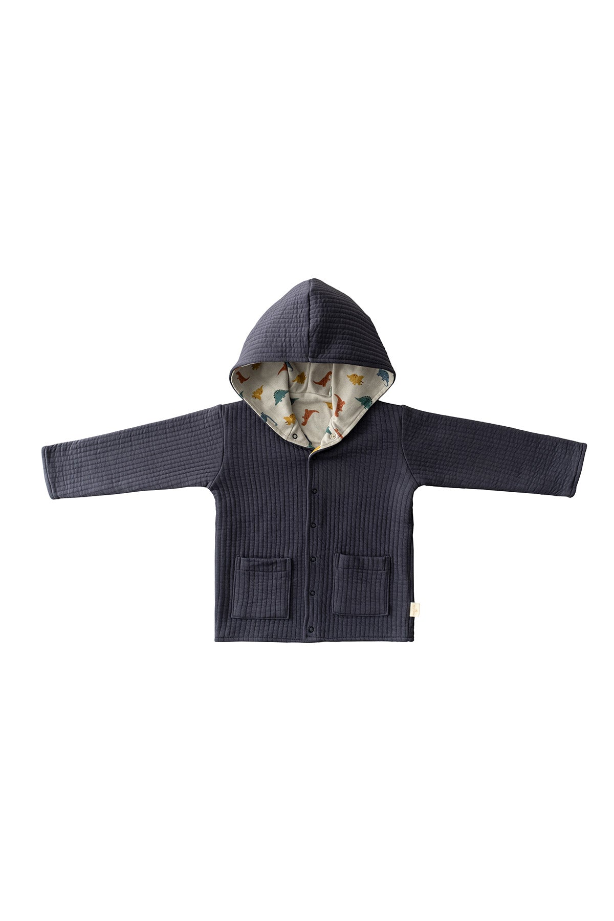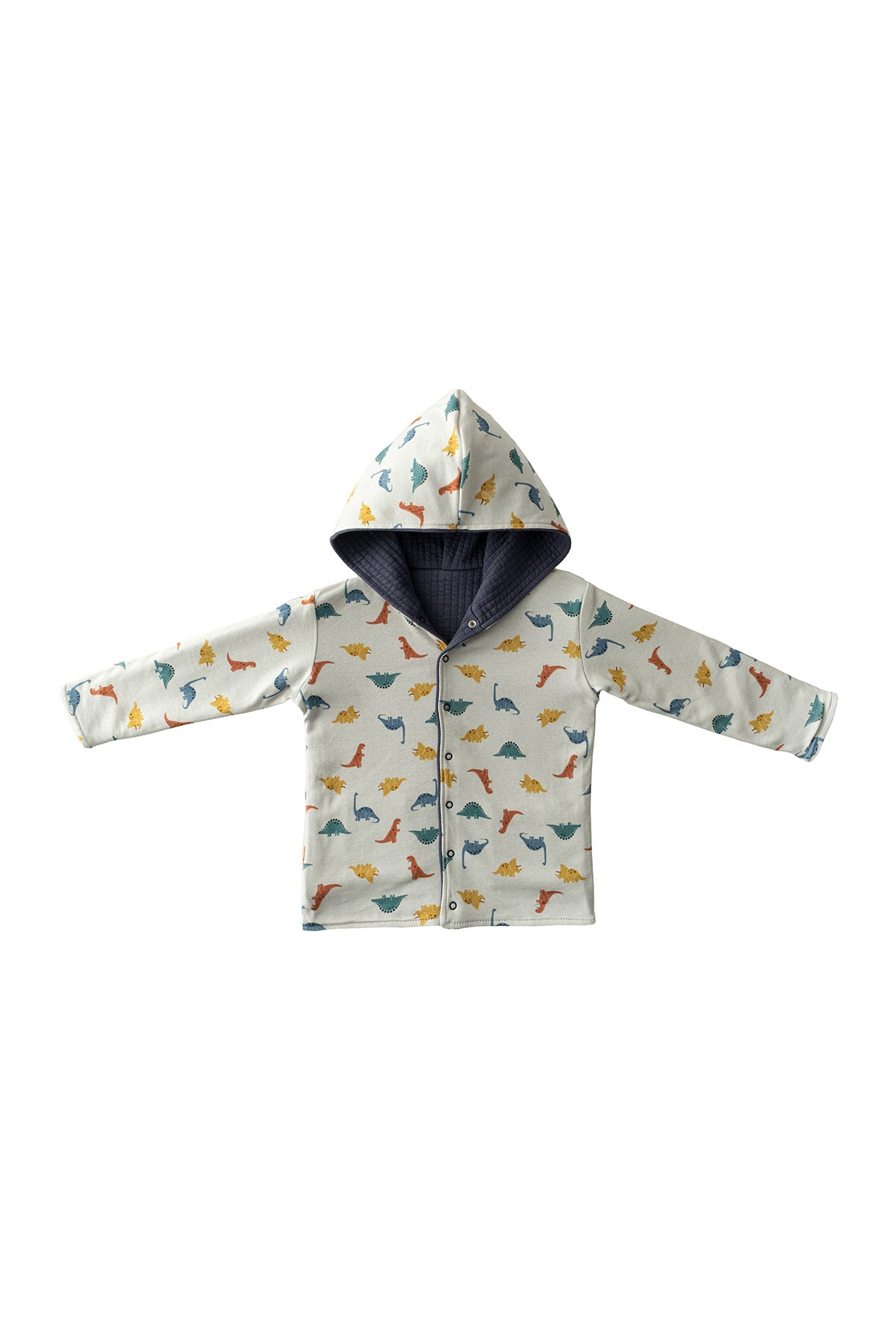 Een heerlijk warm jasje dat je aan twee kanten kunt dragen! 🔁 De diep blauwe buitenkant en de dino print binnenin zorgen voor extra variatie. Perfect voor kleine avonturiers!